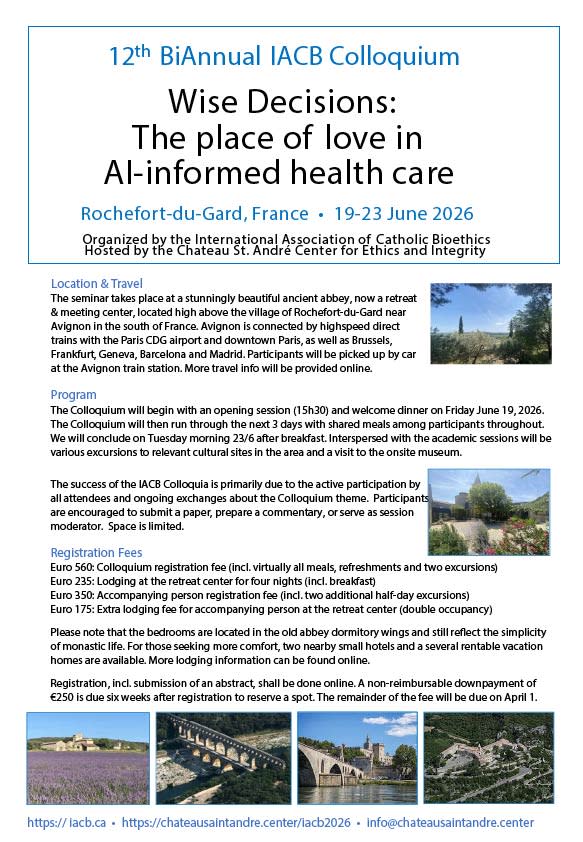 I am also attaching the flyer on a scholarly conference which the Chateau Saint André Center is organizing together with the International Association of Catholic Bioethics. It takes place June 19-23 here in the south of France.