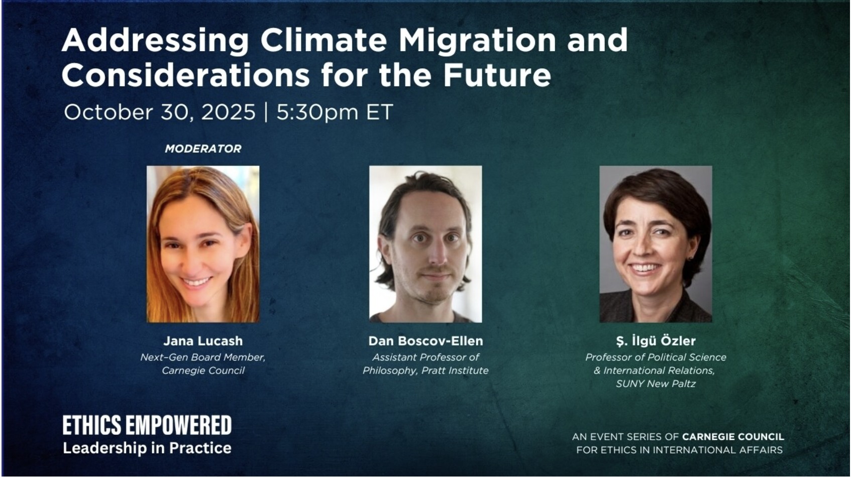 On October 30 at 5:30pm ET, Carnegie Council will host a panel discussion as part of the Ethics Empowered: Leadership in Practice series. The convening will examine this distinct global-scale challenge that goes to the heart of the moral case for both sovereignty and human rights. This session will feature two distinguished experts reflecting on the state of climate migration today and considerations for the future. The Ethics Empowered: Leadership in Practice event series is specifically tailored for students and young professionals to enhance their subject-matter expertise in geopolitics and applied ethics. Register to attend this panel discussion and Q&A.